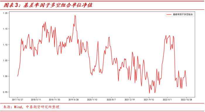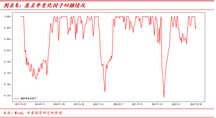 本报告选取的回测区间为2017年11月至2022年10月,每周换仓。选用基差率和基差率变化两个因子进行回测,回测的过程表述如下。