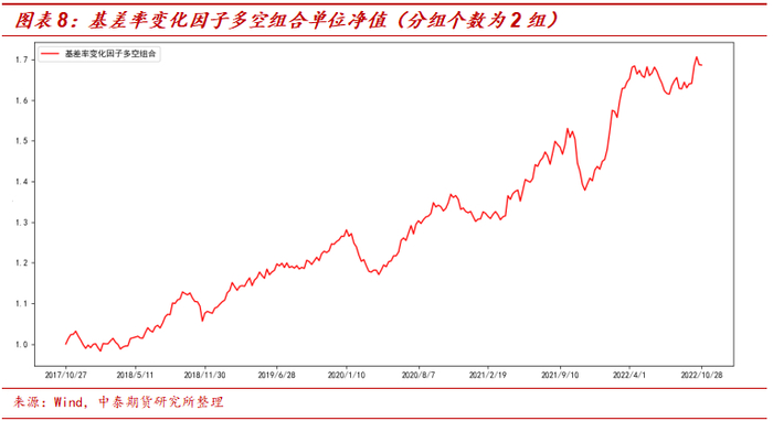 最后可通过计算回测期内基差率变化因子的多空组合单位净值来展示该因子是否有效。具体结果如图表5所示。