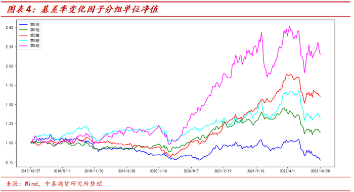 综上分析,本报告考虑测试基差率变化因子的有效性。基差率变化因子的分组单位净值如图表4所示。