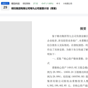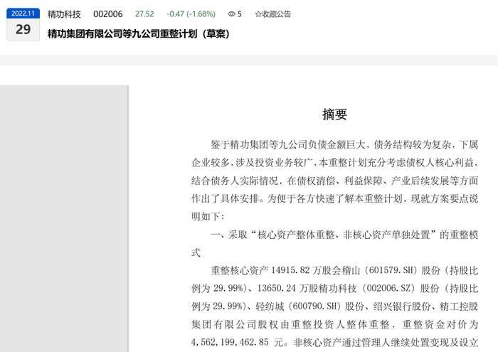 其中包括精功集团所持会稽山股份中的1.49亿股,持股比例为29.99%,资产价值18.73亿元;精功集团所持精功科技中1.37亿股,持股比例为29.99%,资产价值11.85亿元;浙江精功控股有限公司持股轻纺城6370万股,持股比例为4.35%,资产价值1.99亿元;精功集团等公司合计持有的3.33亿股绍兴银行股份,持股比例9.41%,资产价值5.86亿元。另外还包括精比控股集团有限公司股权,这些都是本次重整的核心资产。