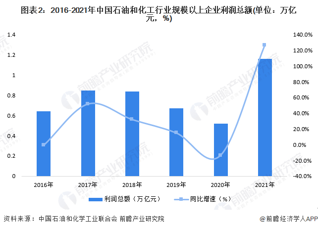 2021年石油和化工全行业实现营业收入14.45万亿元,同比增长30.0%;实现利润总额1.16万亿元,同比增长126.8%。营业收入和利润总额增速双双创造历史新高。