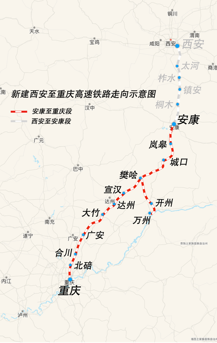 西渝高铁安康至重庆段自安康西站起,经陕西省安康市,重庆市城口县,四川省达州市、广安市,重庆市合川区、北碚区,引入重庆枢纽重庆西站,共设安康西、岚皋、城口、樊哙、宣汉南、达州南、大竹、广安东、合川东、北碚南、重庆西11座车站,其中重庆西为既有车站,其他为新建车站;西渝高铁与郑渝高铁连接线自西渝高铁安康至重庆段樊哙站起,途经四川省达州市,重庆市开州区、万州区,终至郑渝高铁万州北站,新建开州站1座车站。