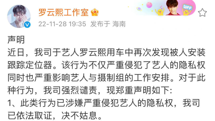 11月28日晚,罗云熙工作室发声明称:艺人罗云熙用车中再次发现被人安装跟踪定位器,该行为不仅严重侵犯了艺人的隐私权同时也严重影响艺人与摄制组的工作安排。