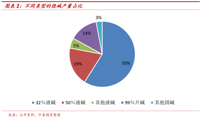 市面上常见的烧碱有液碱和固碱两种,其中液碱根据所含氢氧化钠质量分数可分为30%液碱、32%液碱、42%液碱、45%液碱、50%液碱等,主流规格为32%和50%,固碱市场主要以氢氧化钠含量为99%的片碱为主。目前我国液碱产量占总量的80%以上,99%片碱占比14%左右。市场上流通的纯碱分为轻质碱和重质碱,均为固体状态,根据密度来区分,轻质碱堆积密度为500-600kg/m3,重质碱堆积密度为900-1000kg/m3。重质碱占比在50-60%左右,根据两者价差有10%的调整空间。