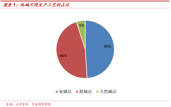 烧碱属于氯碱产业链的中游产品,其生产工业从最开始的苛化法,逐渐被电解法替代,最后演变成现在的离子膜电解法,已经成为我国生产烧碱的主流方法,占比99%以上,生产工艺相对统一。纯碱的生产工艺分为氨碱法、联碱法以及天然碱法,其中氨碱法大约占比49%,联碱法占比46%,天然碱法占比5%左右,随着明年远兴能源天然碱项目的陆续投产,天然碱占比将会有所提升。纯碱不同生产工艺的成本及利润相差很大,其中天然碱成本最低。