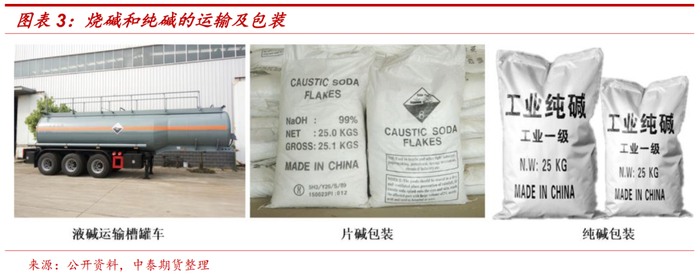 不同的物理形态使得烧碱和纯碱在运输方式及途径上有所差异。液碱运输通常采用普通碳素钢制作的槽罐车,浓度大于 45%或特殊品质要求的液碱宜采用含镍不锈钢制作的槽罐车,片碱一般采用 25kg 三层塑编袋或铁桶。纯碱包装及储存相对简单,可以采用双层和单层的塑编袋包装。液碱作为液体危化品区域性较强,产区和销区均集中在华北和华东地区,固碱生产集中在西北地区。纯碱的产区相对集中,但销区比较分散。相比纯碱来说,液碱运输上更受限制,汽运多在300千米以内。