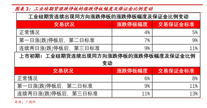 上一交易日结算价±4%。根据2015年至2021年国内主消费地(天津、广州、华东)Si5530、Si4210工业硅现货价格构成的时间序列价格数据进行测算(EWMA模型)。结果显示,工业硅期货合约设计将每日价格最大波动限制设计为4%,可以满足正常价格波动需要,有利于及时释放风险。工业硅期货每日价格涨跌停板为上一交易日结算价±4%,上市初期涨跌停板设置执行标准为±6%。工业硅期货上市首日涨跌停板幅度为合约执行标准的2倍,交割月份的涨跌停板为上一交易日结算价的±6%。上市初期,出现第一个停板当天结算时起,下一个交易日的停板幅度调整至9%;若第二天出现同方向停板,下一个交易日的停板幅度调整至11%,在连续出现第三个同方向停板后,涨跌停板幅度视不同情况而定。