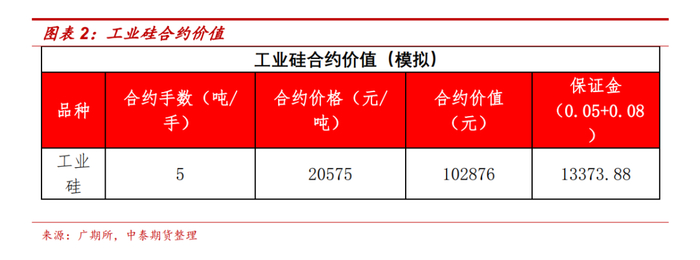 交易单位:5吨/手——合约价值处于商品期货市场上游。工业硅期货交易单位与目前已经上市的有色金属期货品种铜、铝、锌、铅的交易单位保持一致。合约价值处于有色金属板块中游、64个商品期货品种上游,与铝、铁矿石合约价值接近。交易一手工业硅期货约需要1.3万元保证金(考虑期货公司收取5%保证金)。