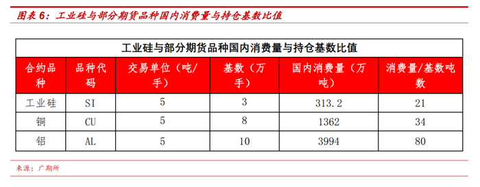 持仓限额制度。持仓限额基数参照已有商品期货品种设计方法。持仓限额的基准设定为单边3万手。工业硅期货对非期货公司会员和客户持仓限额基数的设定参照已有品种的设计方法。将目前表观消费量与非期货公司会员和客户对应的持仓基数进行比较,与有色金属、双硅品种比较,工业硅比值约为21,与锌品种基本一致,处于中游水平。参考市场流通量。国内工业硅现货市场流通量约313万吨。尽管市场有上下游直接贸易惯性,但不影响其参与盘面套保的可能),折合每月流通量约26万吨,约5万手。市场发展潜力。考虑工业硅消费增速较快的特点,把持仓限额阈值定为3万手,可以兼容市场未来的发展。
