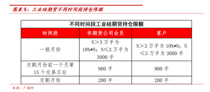 持仓限额制度。兼顾风险管理与企业套保需求。交割月持仓限额为200手(折合现货1000吨)。根据质量摸底检验结果,全国工业硅产量中达到期货交割标准(国标Si5530及以上标准)的比例为77.1%,约224.6万吨,其中Si5530约74.4万吨,Si4210约104.7万吨,进一步考虑行业自由贸易比例、交割区域覆盖范围,测算可供交割量约为137.9万吨。折合每个月11.49万吨,1000吨仅占月度可供交割量的0.8%,风险较为可控。此外,1000吨的限仓最多可以满足114个客户参与交割月的需求,基本可以覆盖行业大部分企业。