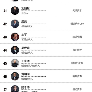 启明创投的主管合伙人胡旭波排在第33位。胡旭波的主要投资领域集中在医疗健康,拥有20年投资经验的他投资总额达到33.1亿元。在新药研发领域,他主要关注两个方面一是企业研发的药物在国内市场是否迫切,二是团队建设是否完善,胡旭波表示,“中国整个医疗市场仍然有较大的潜力,希望能通过投资推动行业发展。”在他的带领下,泰格医药、三友医疗、艾德生物等均完成IPO。