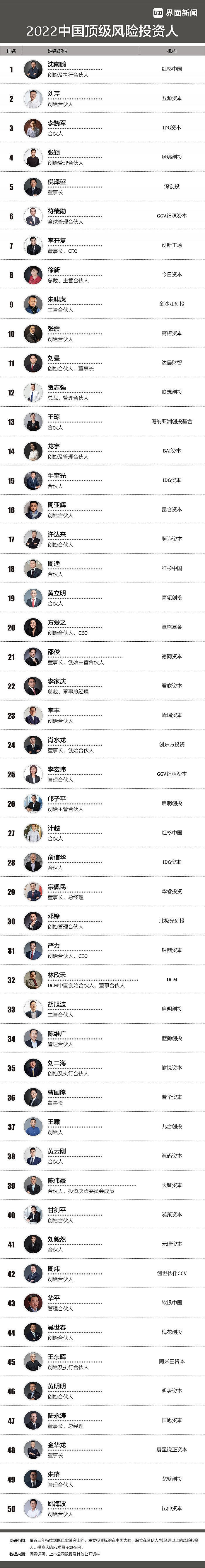 界面新闻2022中国顶级风险投资人榜单发布,沈南鹏、刘芹、李骁军、张颖、倪泽望分列前五