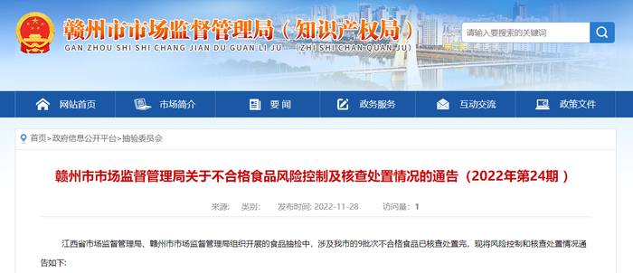 赣州市市场监督管理局关于不合格食品风险控制及核查处置情况的通告(2022年第24期)