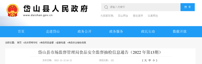 中国质量新闻网讯 近日从浙江省岱山县人民政府网站获悉,岱山县市场监督管理局发布食品安全监督抽检信息通告(2022 年第13期)。