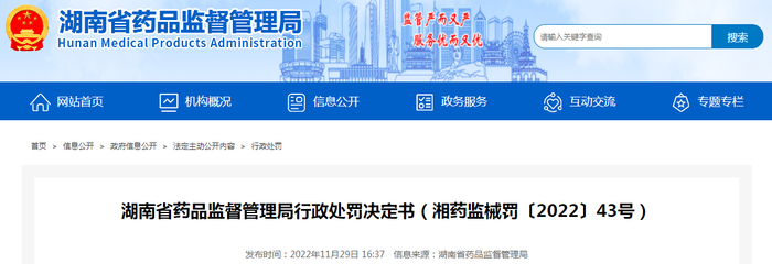 中国质量新闻网讯 近日,湖南省药品监督管理局发布行政处罚决定书(湘药监械罚〔2022〕43号)。