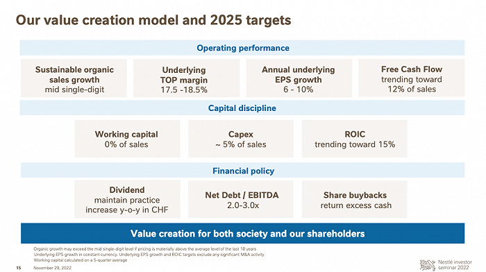 在财务指标方面,雀巢奉行一种“价值创造”模式,这一模式在每股收益增长、有竞争力的股东回报、外部增长的灵活性和进入金融市场的机会等要素间取得平衡。