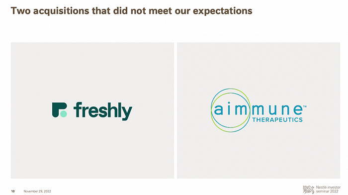 “这里有两笔交易并没有完全达到我们的目标。第一个是Freshly。”施奈德说。小食代介绍过,此前在2020年,雀巢宣布以9.5亿美元 (约合人民币63.5亿元)收购美国新鲜预制餐食外卖公司Freshly,后续如业务继续成功发展,还将支付大约5.5亿美元(约合人民币36.8亿元)。