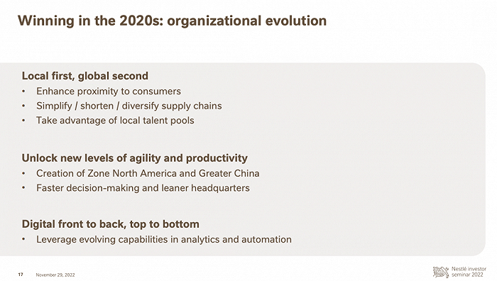 该公司表示,在2021年和2022年成本通胀急剧上升导致利润率受影响后,预计到2025年基本营业利润率将恢复到17.5%至18.5%的区间。今天,在随后按议程继续举行的会议上,雀巢将介绍其通过品牌建设、创新和数字化来促进增长的计划,并表示将通过效率计划来支持利润率增长。