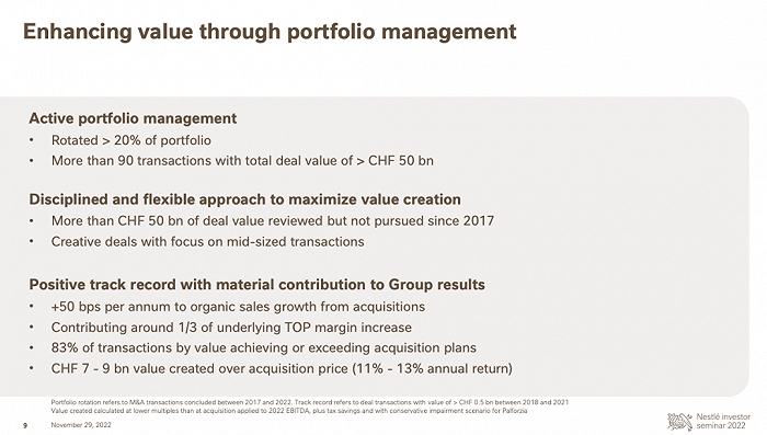 他指出,这些收购为雀巢带来了每年50个基点的有机销售增长,贡献了约1/3的基础交易运营利润率增长,83%的交易在业务价值上达到或超过了收购计划,创造了大约70-90瑞郎的价值(年回报率11%-13%)。“因此,无论是从运营指标还是价值创造的角度来看,我认为我们总体上都拥有相当不错的收购记录。”