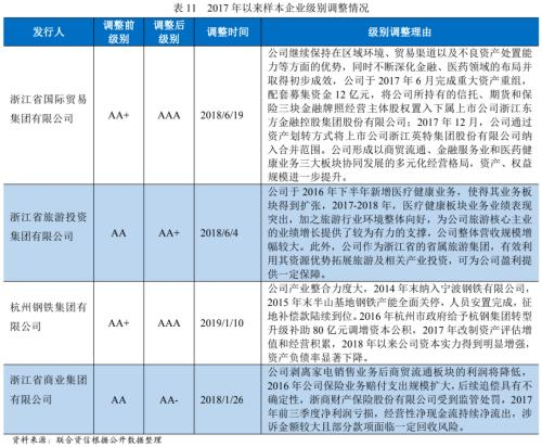级别迁徙方面,近年来,浙江省经济保持良好增长,为样本企业提供了良好的发展环境。2017年以来,3家样本企业信用等级获得调升,原因主要包括合并企业扩大经营规模形成多元化经营格局、完成历史遗留问题的处理以及获得大规模增资等;1家样本企业信用等级调降,原因主要包括出现亏损、业务涉及较大或有风险等。