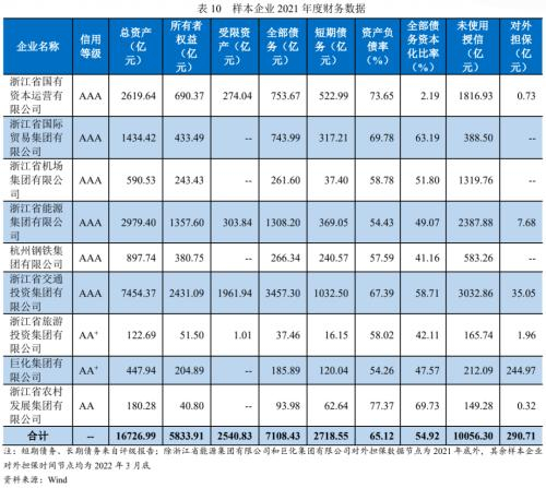 浙江省省属国有企业持有上市公司市值规模大,资产受限比例低,整体资产流动性良好;样本企业整体债务负担可控,债务期限分布偏长期,未使用银行授信充裕,再融资能力强。