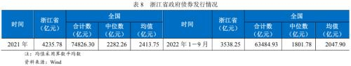2022年1-9月,浙江省共计发行地方政府债3538.25亿元,期末债券余额1.98万亿元,债券余额在全国31省市排名第4名。综合来看,浙江省政府债务负担整体可控。