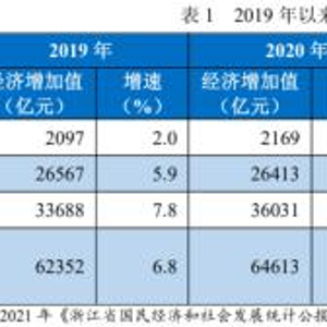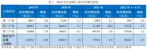 经济方面,近年来,浙江省经济保持稳定增长,经济体量全国领先。根据《浙江省国民经济和社会发展统计公报》,2019-2021年,浙江省GDP总量分别为62352亿元、64613亿元和73516亿元,全国排名均位列第4。按同期按可比价格计算的GDP增速分别为6.8%、3.6%和8.5%,均高于同期全国GDP增速,与其他省份相比,增速位列全国第六。产业结构方面,浙江省内经济以第二、三产业为主,2021年三项产业结构为3.0∶42.4∶54.5,同比基本保持稳定。2022年上半年,浙江省GDP按可比价格计算同比增长2.5%,实现GDP总量36222亿元,全国排名第四。