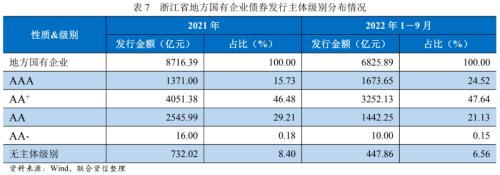 从国企发行人分布看,不考虑金融企业,2021年,浙江省地方国有企业发行债券合计8716.39亿元,同比增长约50%,其中,发行时主体级别为AA+的企业发行金额规模最大。2022年前三季度,同口径下浙江省地方国有企业发行债券合计6825.89亿元,以发行时主体级别为AA+的企业为主,比重与2021年全年持平。