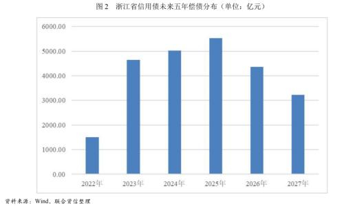 债务期限分布方面,不考虑金融债,截至2022年9月30日,浙江省存续信用债券以中长期债券为主。2022年10-12月,浙江省内信用债将到期兑付1498.98亿元,2023-2025年,浙江省存续债兑付规模逐年增长,2025年为偿还高峰,当年需偿还5527.25亿元。