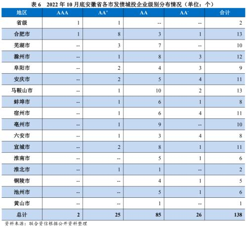 截至2022年10月底,安徽省内有存续债券且有主体级别的城投企业共138家,其中省级2家、市级46家、区县级67家、园区级23家。从各地级市企业分布看,安徽省所有地级市均有发债城投企业;其中合肥市和马鞍山市为13家,滁州市12家,安庆市、宿州市和宣城市为11家,黄山市有存续债券且有主体级别的城投企业数量最少,仅有1家。从主体级别区域分布看,其中AAA级城投企业2家,分别为1家省属企业和1家合肥市属企业;AA+级城投企业25家,其中1家为省级城投企业、17家为市级城投企业、3家为合肥市所属园区企业、4家为区县级城投企业;AA级城投企业85家,主要为地级市或区县级城投企业;AA-级城投企业26家,除2家为市级城投企业,1家为马鞍山市所属园区企业外,其他均为区县级城投企业。