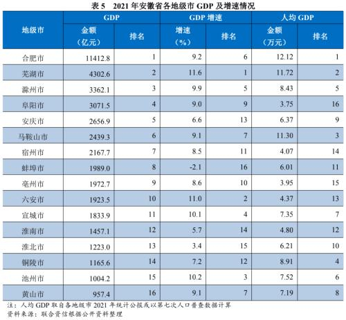 从GDP增速来看,2021年,安徽省各地级市GDP增速分化较为明显,其中芜湖市、六安市、池州市和宣城市GDP增速达到10.0%及以上,芜湖市增速最快;滁州市、合肥市、马鞍山市、黄山市和阜阳市GDP增速均位于9.0%及以上;亳州市和宿州市GDP增速分别为8.6%和8.5%;铜陵市、安庆市等地GDP增速相对较慢;受工业支撑不强、新增入规企业数量少且体量小、以及环保督察致使部分重大项目停工等因素影响,蚌埠市GDP出现负增长(-2.1%)。