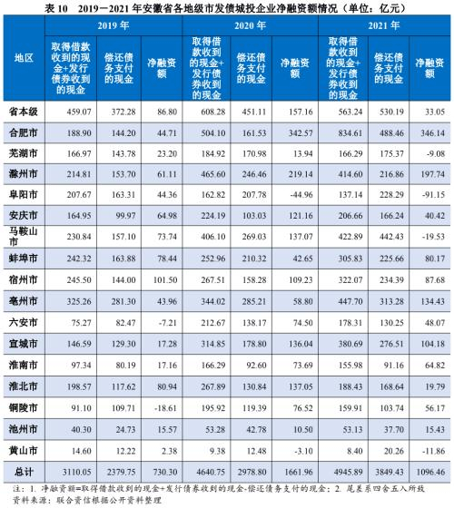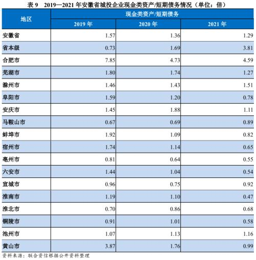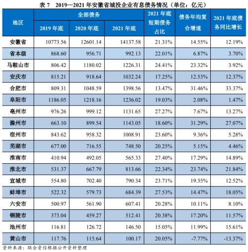 2019年以来,安徽省城投企业有息债务规模持续增长,债务结构以长期债务为主。安徽省城投企业整体资产负债率和全部债务资本化比率均呈上升态势,其中阜阳市、淮北市和亳州市的城投企业债务负担明显高于其他地级市。安徽省城投企业整体短期偿债能力强,其中合肥市尤为突出,但淮南市、六安市、亳州市、铜陵市、宿州市、淮北市、阜阳市、蚌埠市、马鞍山市、宣城市和黄山市城投企业短期偿债能力偏弱。除合肥市、蚌埠市、亳州市和池州市外,2021年其他地级市城投企业净融资额同比均有所下降,其中芜湖市、阜阳市、马鞍山市和黄山市净融资规模表现为净流出;安徽省融资环境有所收紧。亳州市、滁州市和阜阳市的城投企业2023年集中到期债券规模大。
