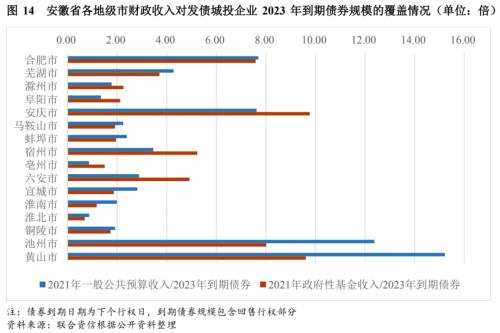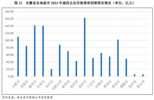 从各地市城投企业存续债券2023年到期规模看,亳州市、滁州市和阜阳市2023年到期债券规模大,池州市和黄山市城投企业到期债券规模相对较小。