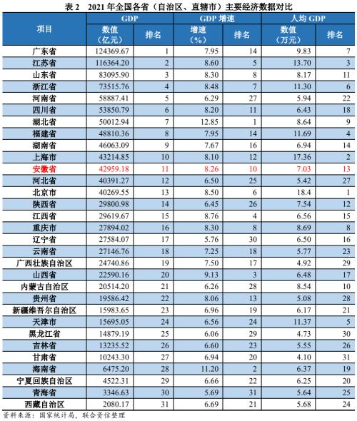 安徽省位于我国中部地区,靠近长三角核心区,区位优势明显;2019-2021年,安徽省地区生产总值(GDP)持续增长但增速有所波动,GDP、人均GDP在全国处于中上游水平,产业结构持续调整,总的经济发展态势良好。2022年前三季度,安徽省经济持续向好。