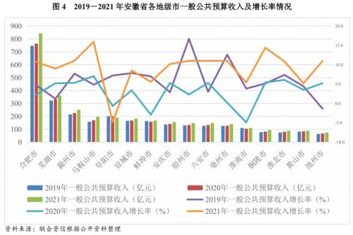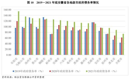 安徽省各地级市财政实力分化明显,合肥市领先地位突出,整体稳定性较好;2021年,除阜阳市外,安徽省各地级市一般公共预算收入均实现增长;各地级市财政自给率同比均有所提高,但除合肥市、芜湖市和马鞍山市外,其他地级市财政自给率均在60%以下,财政自给能力较弱。2019年以来,安徽省各地级市政府债务余额均呈持续上升趋势,政府债务负担加重。