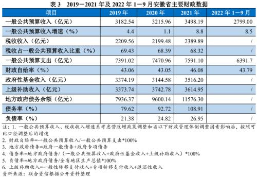 安徽省位于我国中部地区,经济总量处于全国中上游水平。2019―2021年,安徽省经济持续增长但增速有所波动,产业结构以第二、三产业为主,高新技术产业发展较快。2022年前三季度,安徽省经济持续向好。2021年,安徽省一般公共预算收入在全国排名中上游,一般公共预算收入稳定性尚可,财政自给率一般;安徽省政府负债率一般,政府债务率偏高。