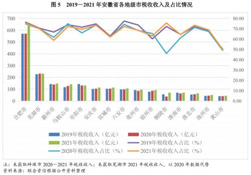 从一般公共预算收入增速来看,2021年,除蚌埠市、淮南市、黄山市和阜阳市以外,安徽省另外12个地级市一般公共预算收入增速均超过8.0%,其中马鞍山市(15.9%)和铜陵市(14.4%)增速相对较快。2021年阜阳市一般公共预算收入同比下降4.8%,主要系收入结构不够优化、重点行业税收下降、减收因素不断增多等多种因素叠加所致。