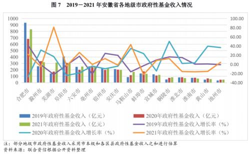 政府性基金收入方面,2019-2021年,安徽省各地级市政府性基金收入规模波动较大。2021年,安徽省各地级市政府性基金收入呈分化态势,合肥市政府性基金收入规模远高于其他城市,全年实现832.39亿元,占安徽省政府性基金收入的23.67%;滁州市、芜湖市、阜阳市、六安市、亳州市、宿州市和安庆市政府性基金收入规模均超过200亿元,处于第二梯队;马鞍山市、蚌埠市和宣城市政府性基金收入规模处于120.00~160.00亿元,其余地级市政府性基金收入均在100亿元以下。2021年,芜湖市和马鞍山市政府性基金收入显著增长,增速分别为81.18%(受益于国有土地使用权出让收入和国有土地收益基金收入增长)和43.26%;六安市、合肥市、铜陵市和宿州市政府性基金收入增幅在12.00%~26.00%之间,宣城市和池州市政府性基金收入增速分别为8.43%和4.37%,其余地级市均呈现负增长态势,其中蚌埠市降幅最大,受国有土地使用权出让收入下降影响,较2020年下降22.40%。