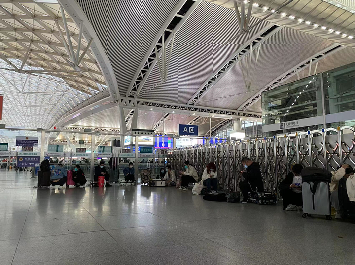 有3名居住在海珠,老家在湖北的人士携带行李,在检票口外空地处等候。其中一人表示,其乘车时间是明天,但看到网上很多人说不一定能走,所以提前过来看看。他们表示都持有24小时核酸结果。“有些小区还封着走不了,但我们没封,可以走。”