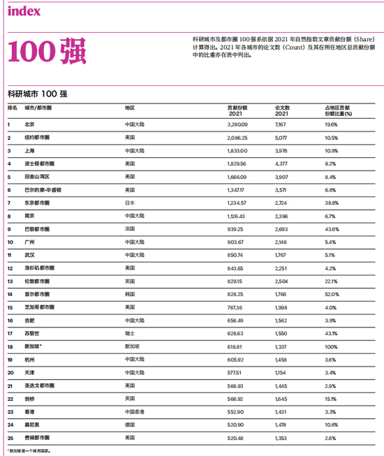 近日,全球知名的《自然》杂志增刊《2022自然指数 科研城市》公布了全球科研城市排名,在前20中有6座中国城市,其中天津排名全球第20,这也是天津首次进入全球前20,按照该指数,天津的贡献份额为577.51、2021年的论文数为1154,占地区(中国)份额比重为3.4%。