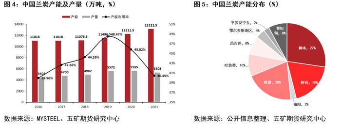 据MYSTEEL数据,截至2021年,我国兰炭年产能约为1.31亿吨,年产量在5308万吨,产能利用率仅40.45%。产能主要分布在陕西、新疆、内蒙、宁夏及河北地区。其中,陕西(产能占比约48%)及新疆(产能占比约37.5%)是我国兰炭产能占比最大的两个区域。陕西的产能主要集中在榆林的神木(产能占比约27%)及府谷地区(产能占比约19%)。新疆的产能主要集中在哈密地区(产能占比约20%)。