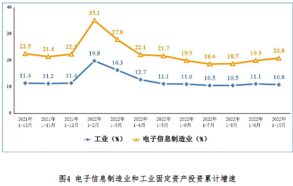 1—10月份,电子信息制造业固定资产投资同比增长20.8%,比同期工业投资增速高10个百分点,但比高技术制造业投资增速低2.8个百分点。