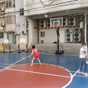 200多平方米的场地内,篮球架从低到高依次排开了4个,高度从1.2米到3.3米不等。这样可以保证小区内从2岁的“小小孩”到成年人都能上场打篮球。但因为运动场宽度不够,每个球框“都按比例缩小了宽度”。