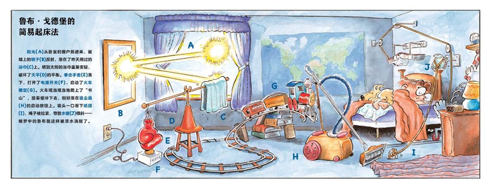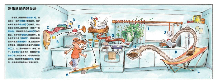 戈德堡被称为STEM(科学、技术、工程、数学)教育之祖父,他创造的“戈德堡机械”已成为专有名词,被收录在韦氏词典里。本书由戈德堡的孙女珍妮弗·乔治和著名漫画家、漫画界大奖鲁本奖获得者埃德·斯特克利携手创作,涵盖了14个戈德堡机械,每个装置都由杠杆、滑轮、天平、弹簧、斜面等一系列物体组装而成,综合运用了各学科知识。