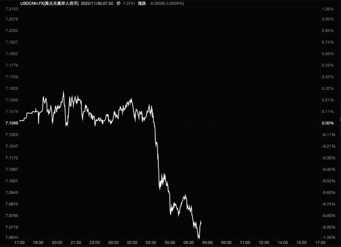 11月30日,在岸、离岸人民币对美元汇率继续反弹。Wind数据显示,截至20:30,在岸人民币对美元汇率报7.0700元,较前收盘价涨963个基点,盘中最高报7.0698元;离岸人民币对美元汇率报7.0741元,较前收盘价涨658个基点,盘中最高报7.0644元。