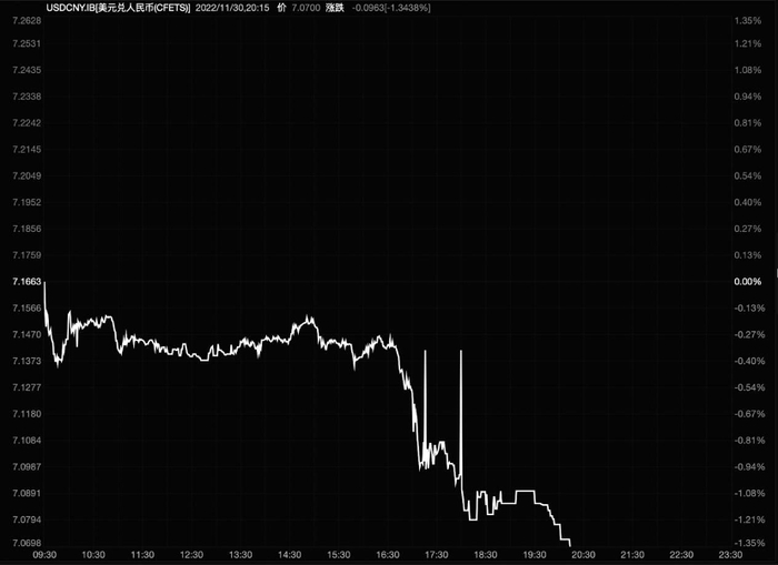 11月30日,在岸、离岸人民币对美元汇率双双升破7.10元关口。截至20:30,在岸人民币对美元汇率涨幅约1.34%;离岸人民币对美元汇率涨幅约0.92%。这是人民币汇率连续第二天上涨。