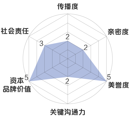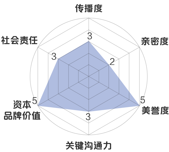 新浪财经品牌价值模型:传播度3分,亲密度2分,美誉度5分,关键沟通力3分,资本品牌价值5分,社会责任3分