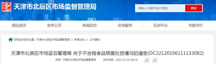 中国质量新闻网讯 2022年12月1日,天津市北辰区市场监督管理局发布关于不合格食品核查处置情况的通告(DC22120106111133082)。
