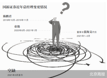 而在“赖小民案”发生后,国新证券高管人事变动频频,上任总经理更是大多任职不到一年。回顾此前,2018年10月,陈鹏君接任国新证券总经理一职,并于2019年11月调任华融汇通资产管理有限公司董事长。直至2020年8月,国新证券迎来新任总经理童艳。然而童艳在加入国新证券仅四个多月后,于2021年1月离任,由彼时公司董事长张海文代为履行总经理职责。同年3月,张海文不再代为履行总经理职务。至此,国新证券总经理一职开始空缺,并延续至今。
