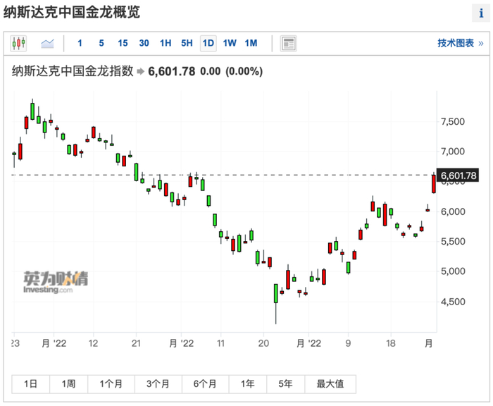 11月最后一个交易日,涵盖一篮子65家在美上市中概股公司的纳斯达克中国金龙指数强势暴涨9.62%,使得当月累计涨幅扩大至42.13%,创下有记录以来最大单月涨幅。该指数的最新收盘点位为6601.78,相较于这一轮调整的最低点,累计涨幅更是高达60.48%。